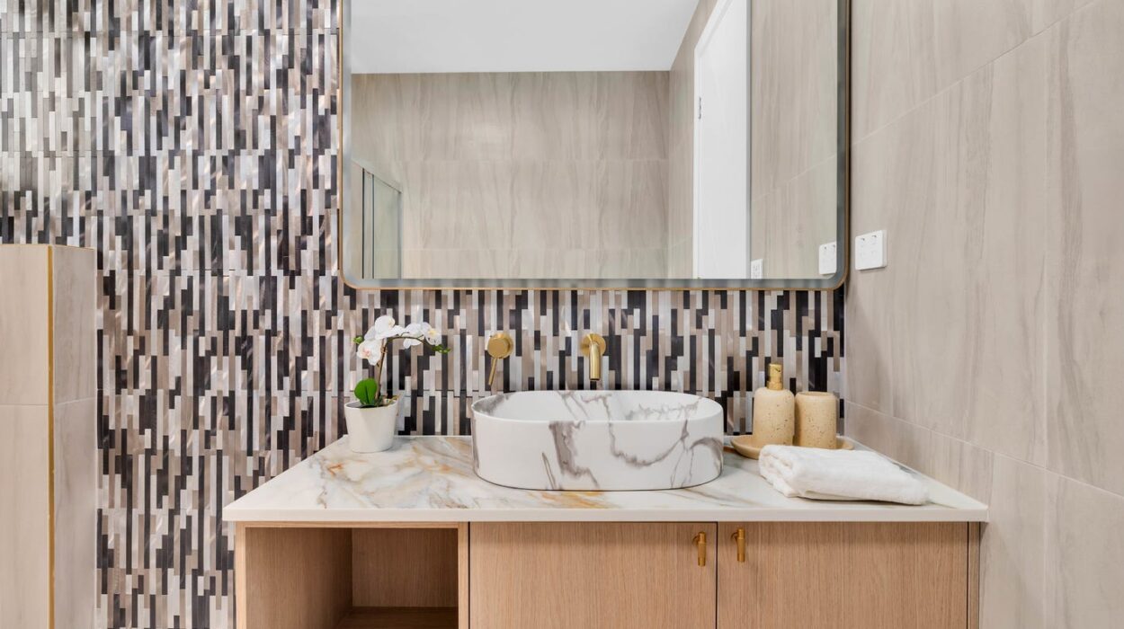 - Gold Accents: Gold hardware and fixtures, such as cabinet handles and faucet, bring a subtle touch of luxury, adding elegance and refinement to the design without overpowering the neutral tones.