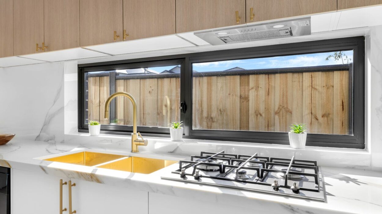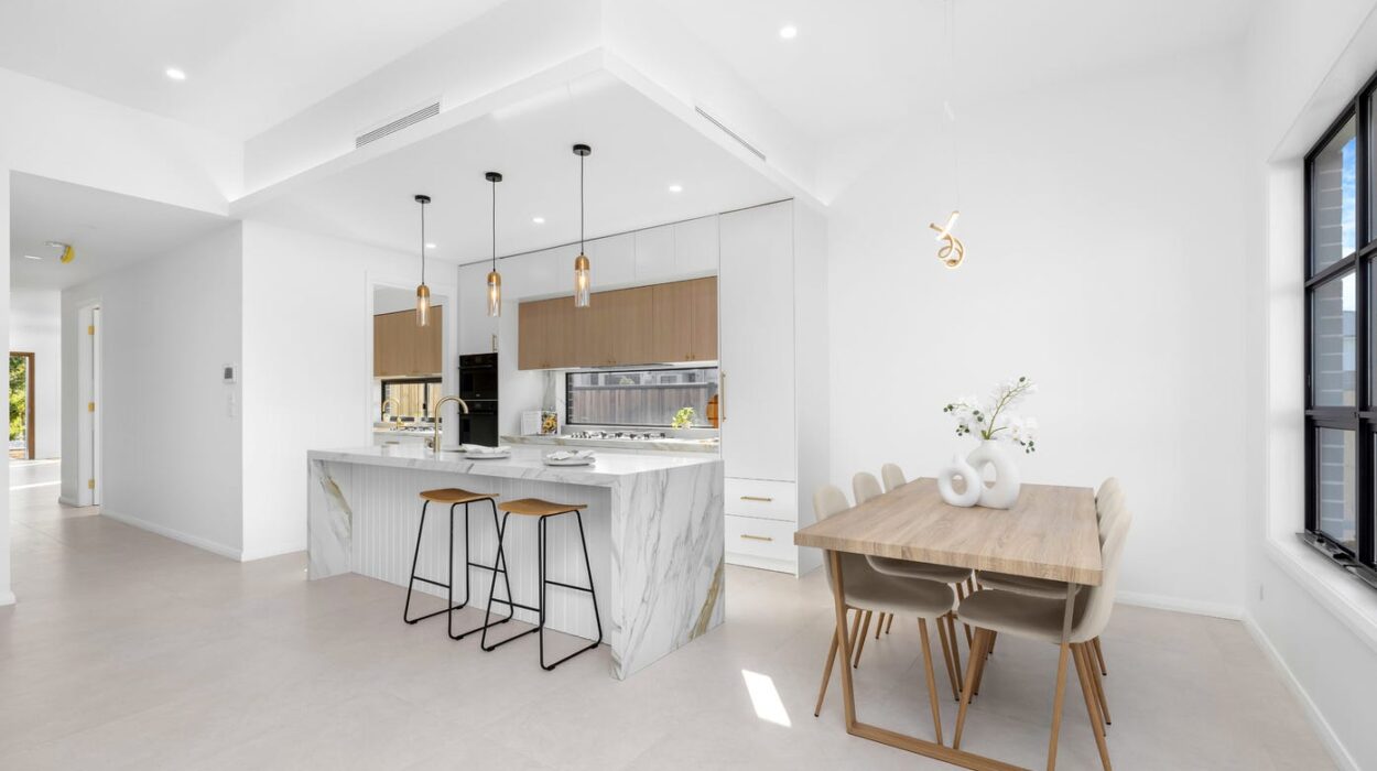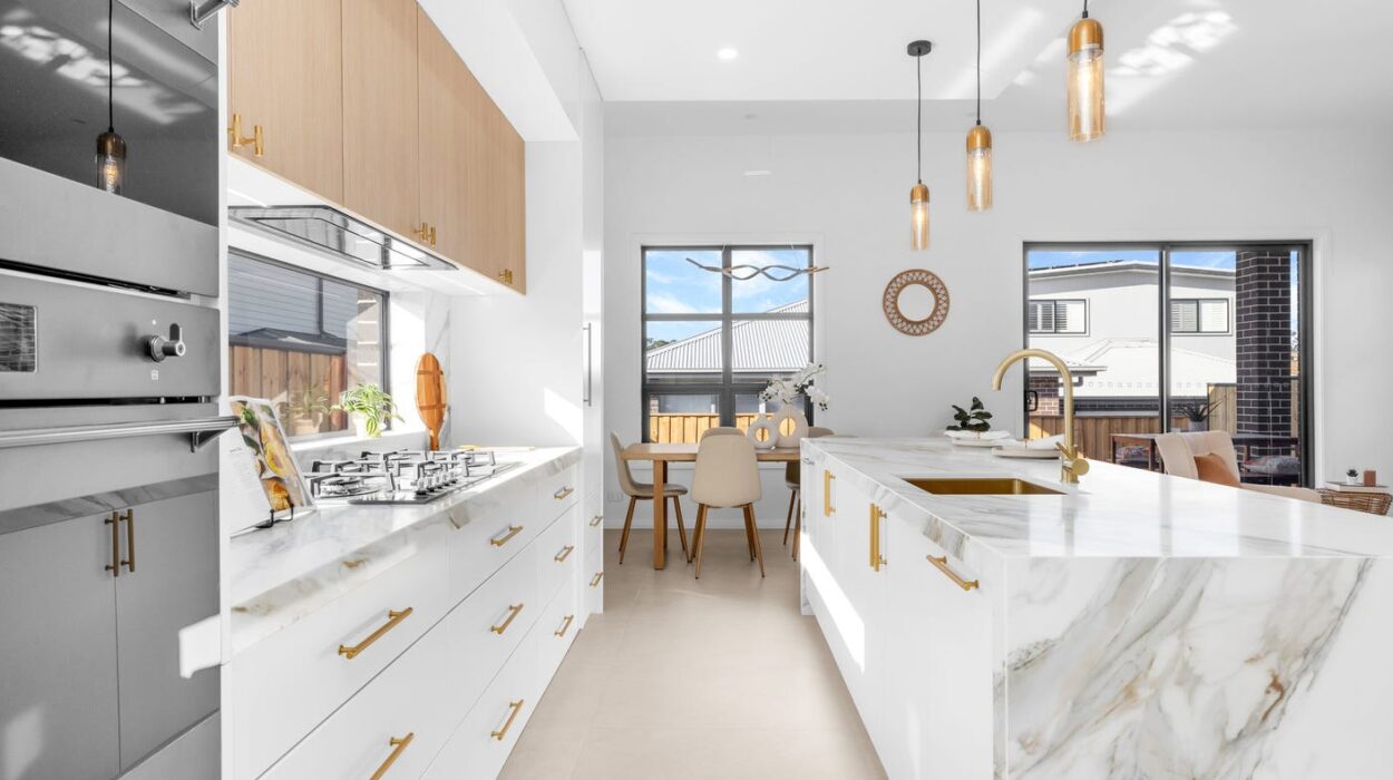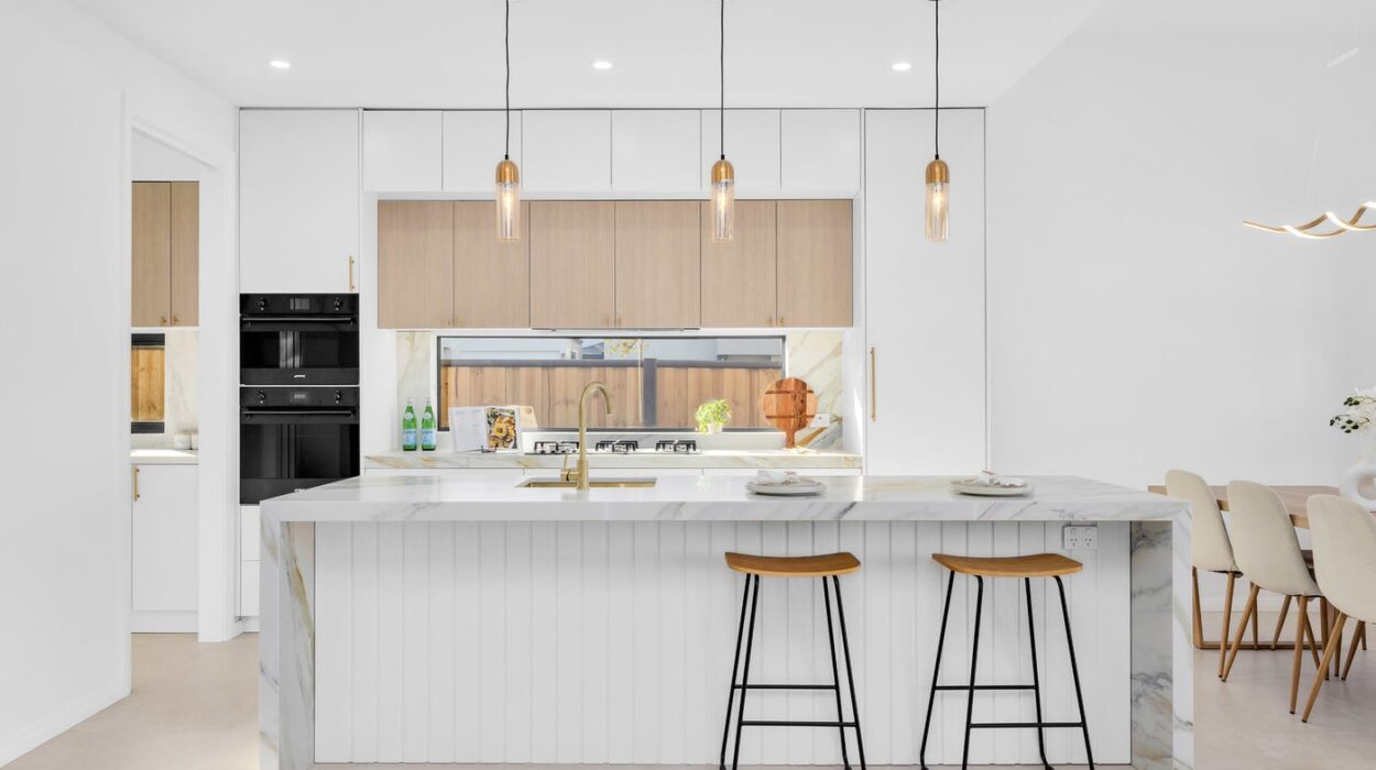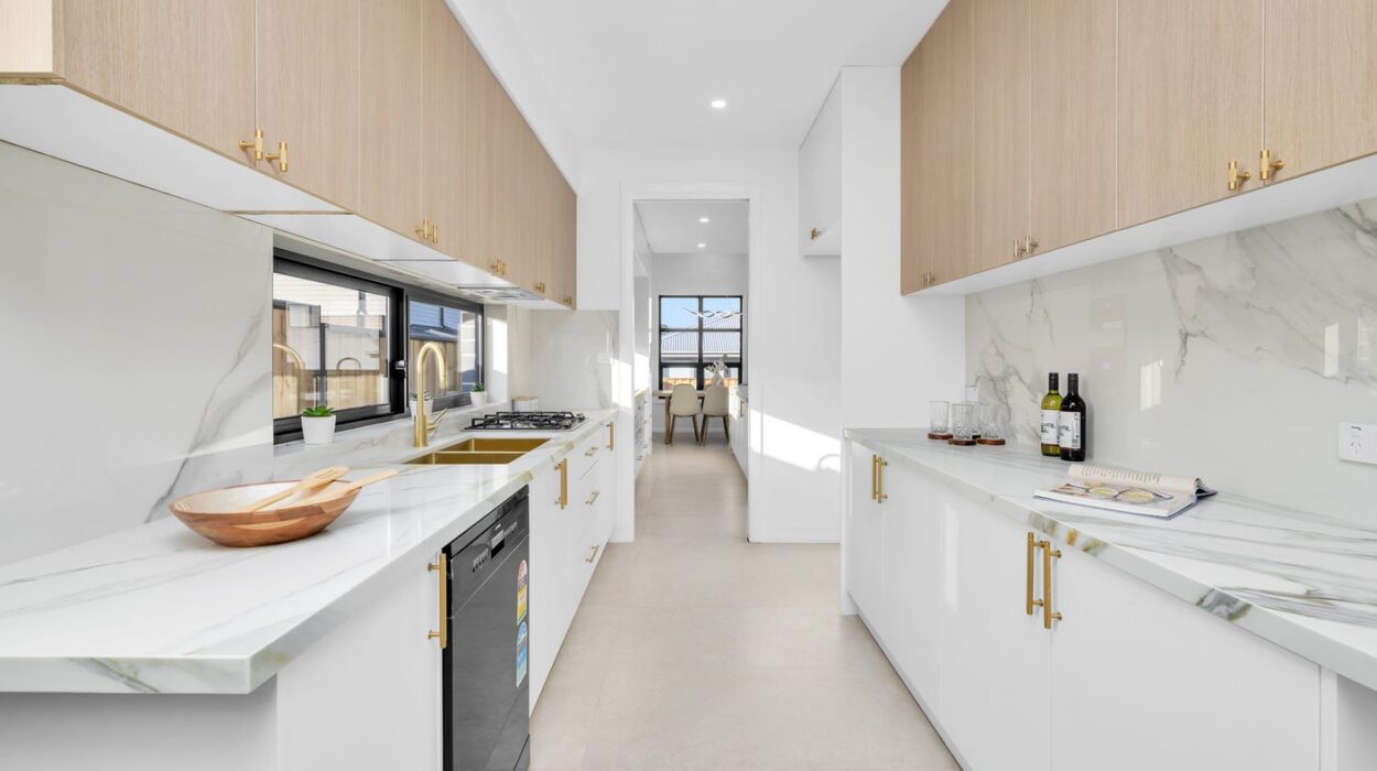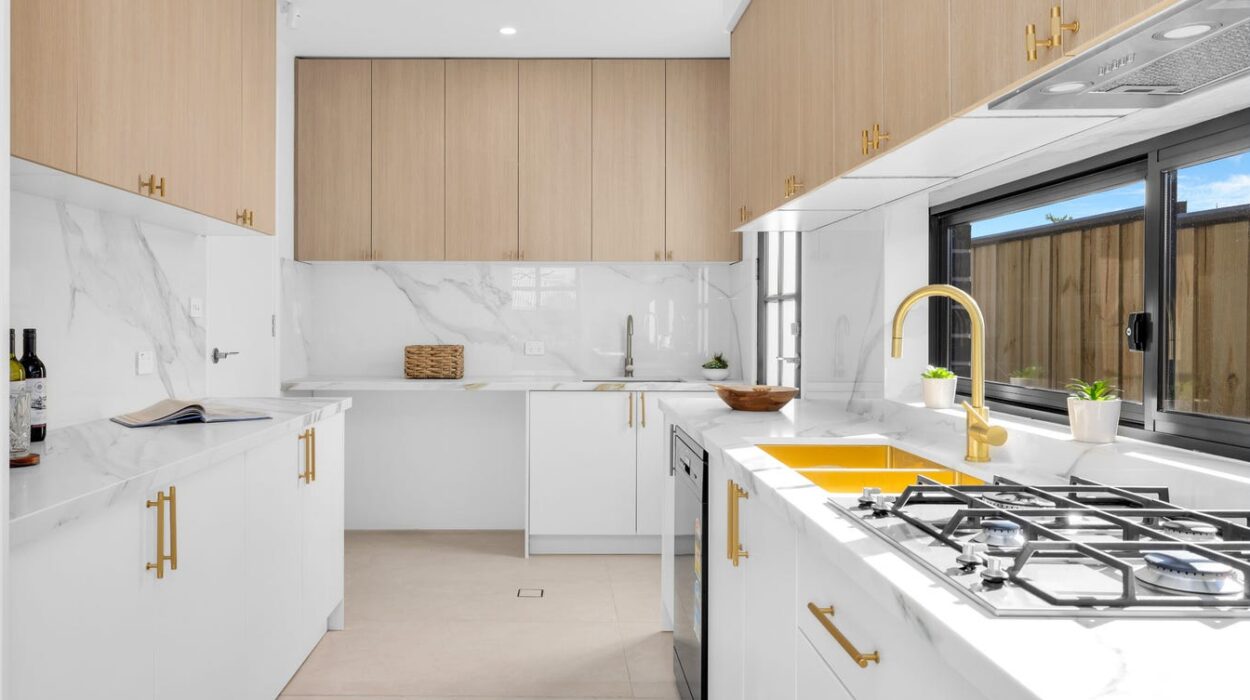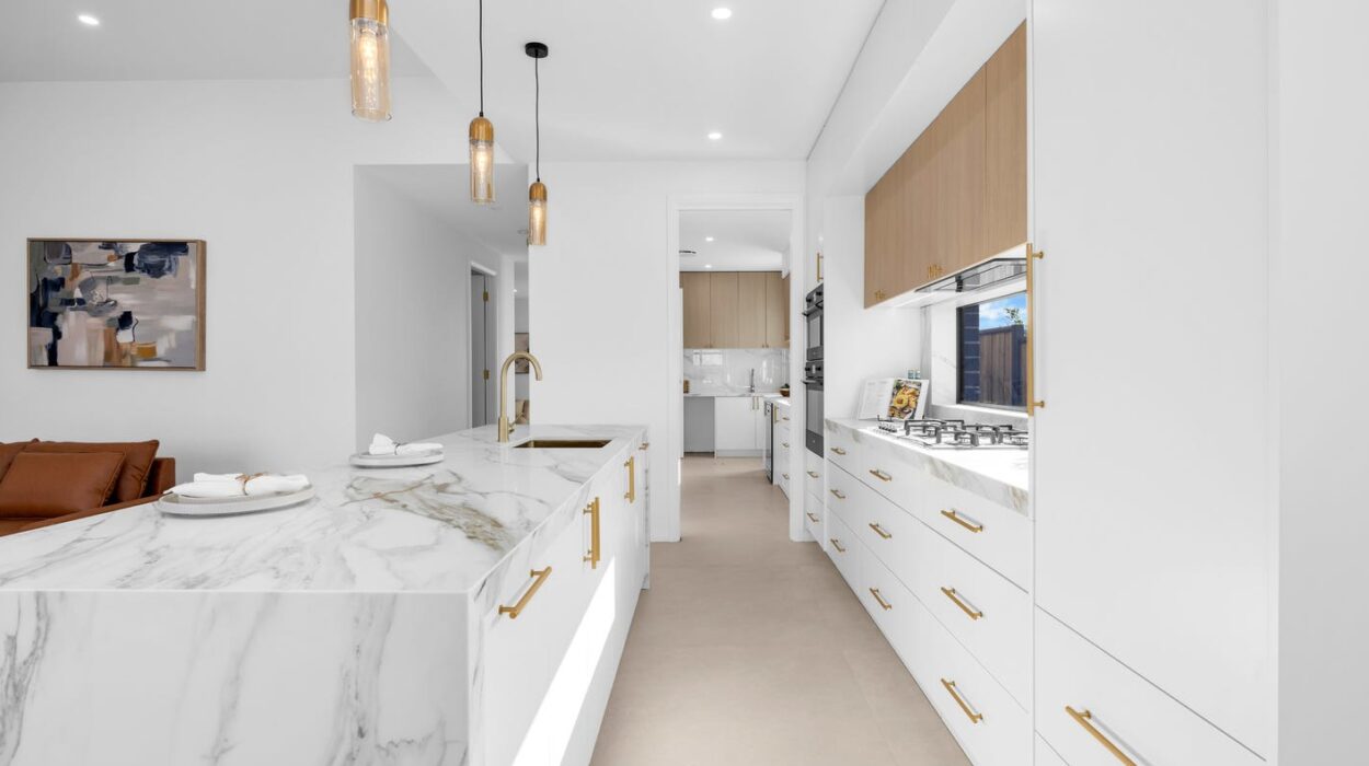 - Material: The benchtops are made from high-quality quartz or marble, offering a polished, durable surface that complements the modern aesthetic. The light color enhances the spacious feel of the kitchen.