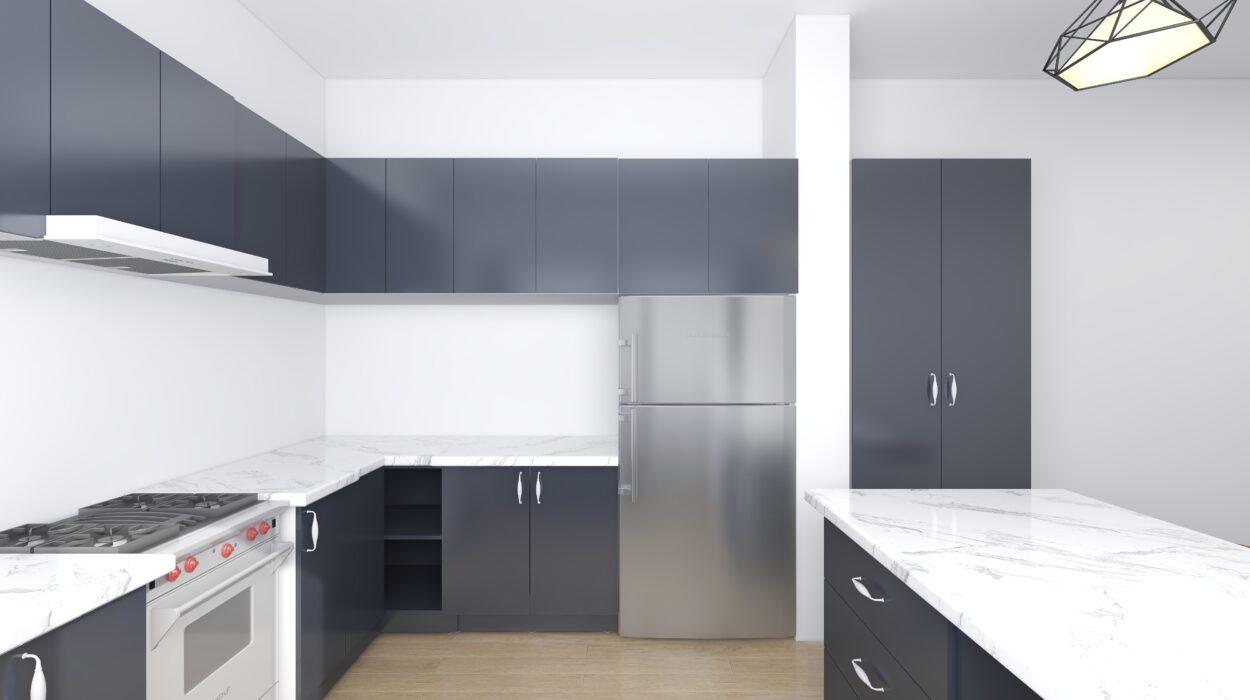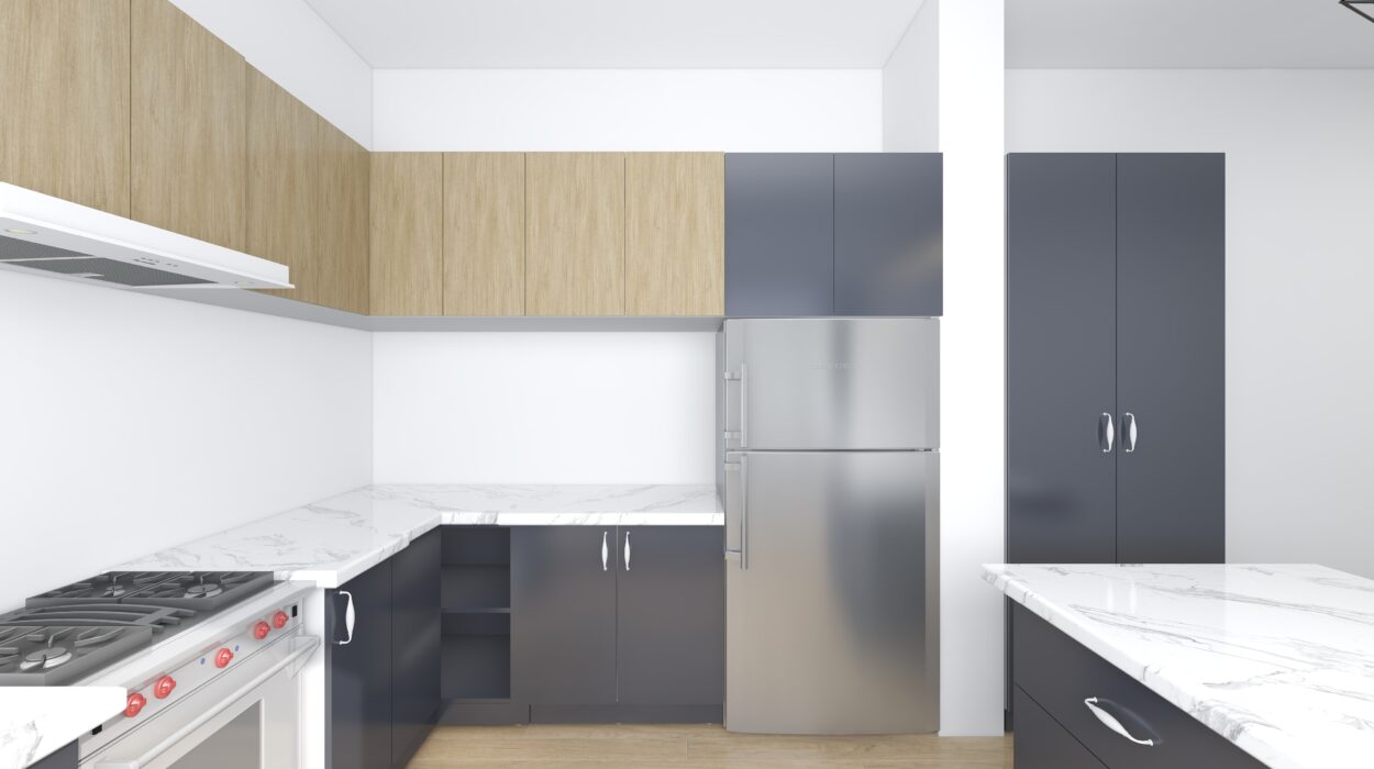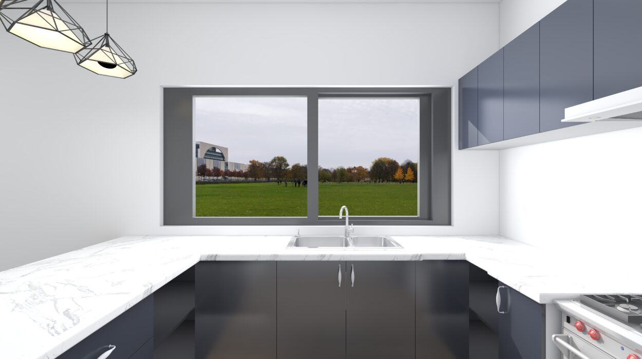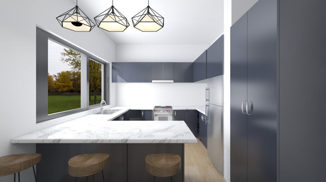 The modern design of this kitchen focuses on clean lines, functional layout, and sleek finishes. The use of minimalist cabinetry, high-end appliances, and durable materials like quartz countertops and engineered stone creates a stylish yet practical space. Neutral tones with subtle accents, combined with smart storage solutions and integrated lighting, enhance the kitchen's contemporary feel, offering both elegance and efficiency.
