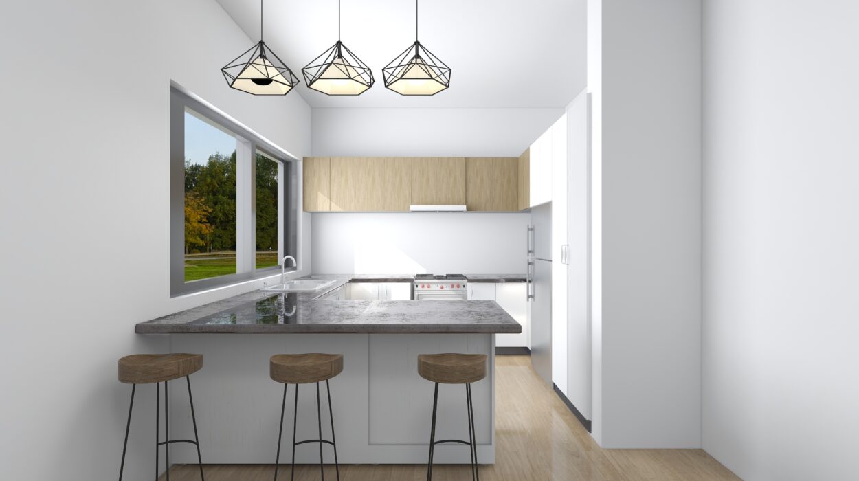 This sleek and minimalist kitchen embraces modern design with a focus on functionality and style. The U-shaped layout maximizes workspace and efficiency, making it ideal for both cooking and entertaining. Crisp white cabinetry pairs seamlessly with light wood accents, creating a warm yet contemporary aesthetic. The dark, textured benchtops provide a striking contrast, adding depth and sophistication to the design. With its thoughtful balance of practicality and modern elegance, this kitchen offers a perfect blend of form and function.